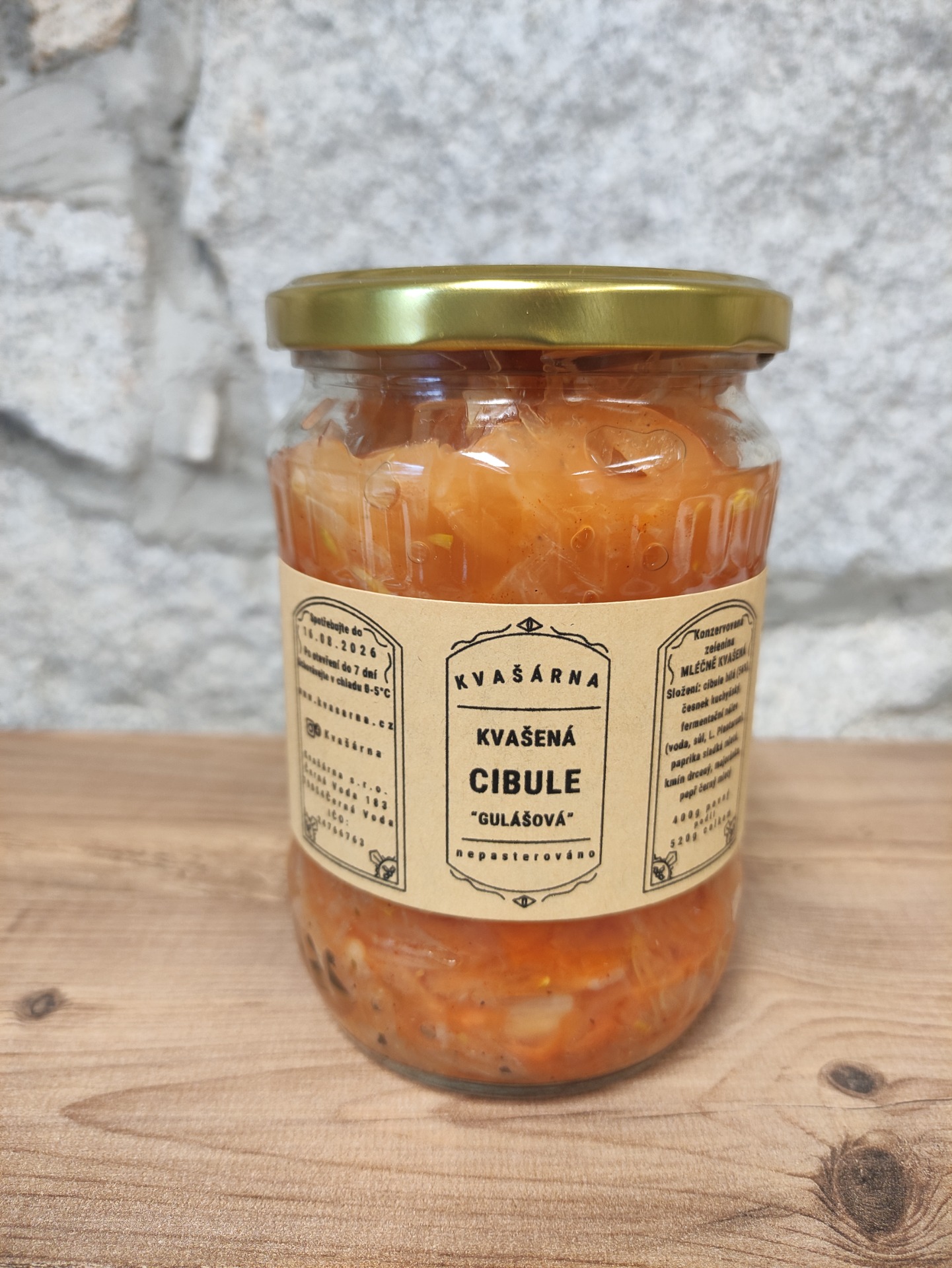 Složení: cibule bílá (56%), česnek kuchyňský, fermentační nálev (voda, sůl, L. Plantarum), paprika sladká mletá, kmín drcený, majoránka, pepř černý mletý.