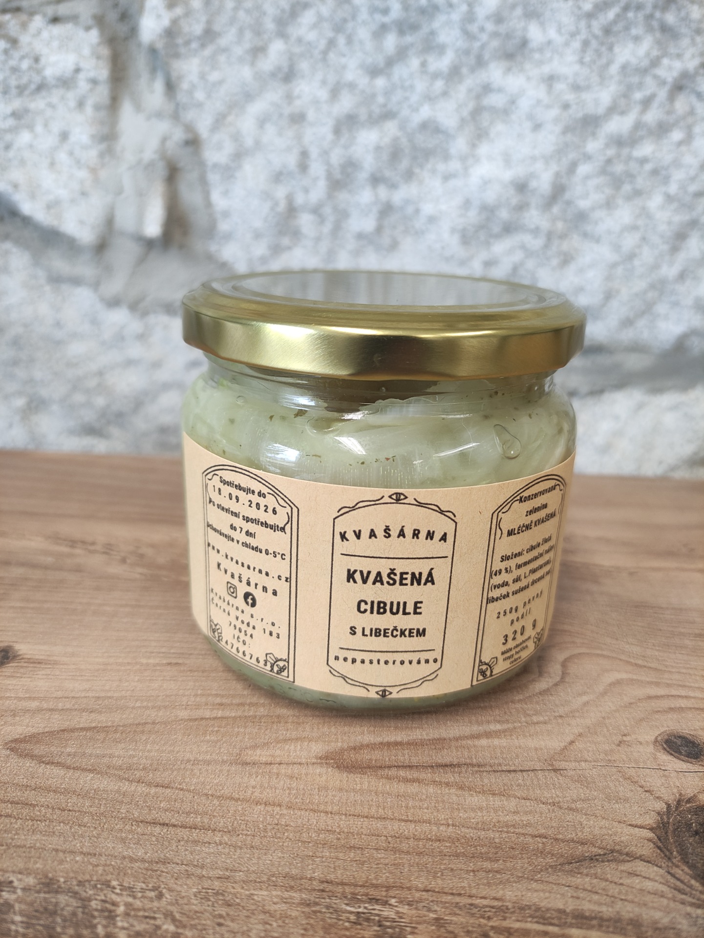 Složení: cibule žlutá (49%), fermentační nálev (voda, sůl, L. Plantarum), libeček sušená drcená nať.