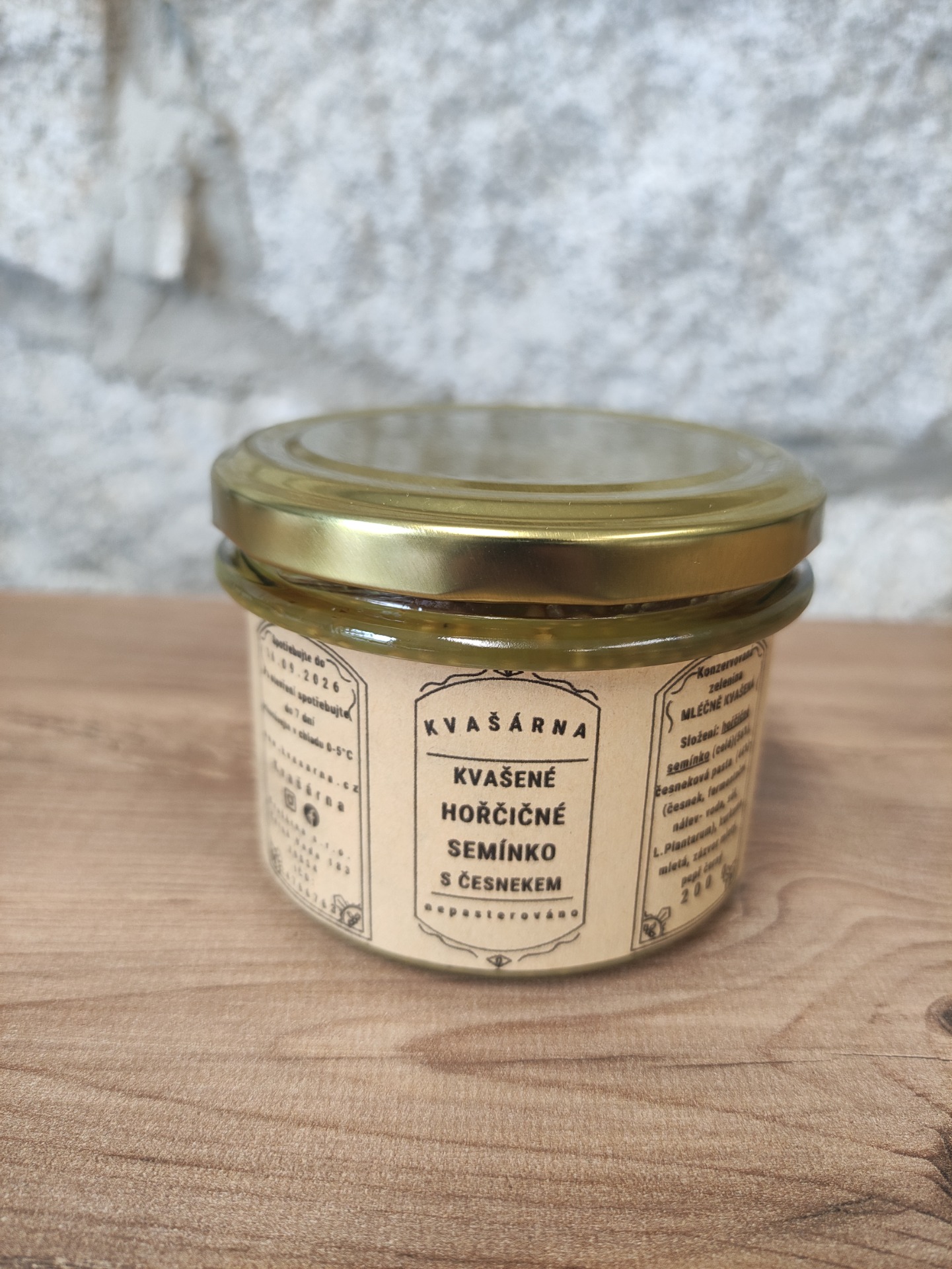 Složení: hořčičné semínko (celé)(56%), česneková pasta (44%) - (česnek, fermentační nálev - voda, sůl, L. Plantarum), kurkuma mletá, zázvor mletý, pepř černý