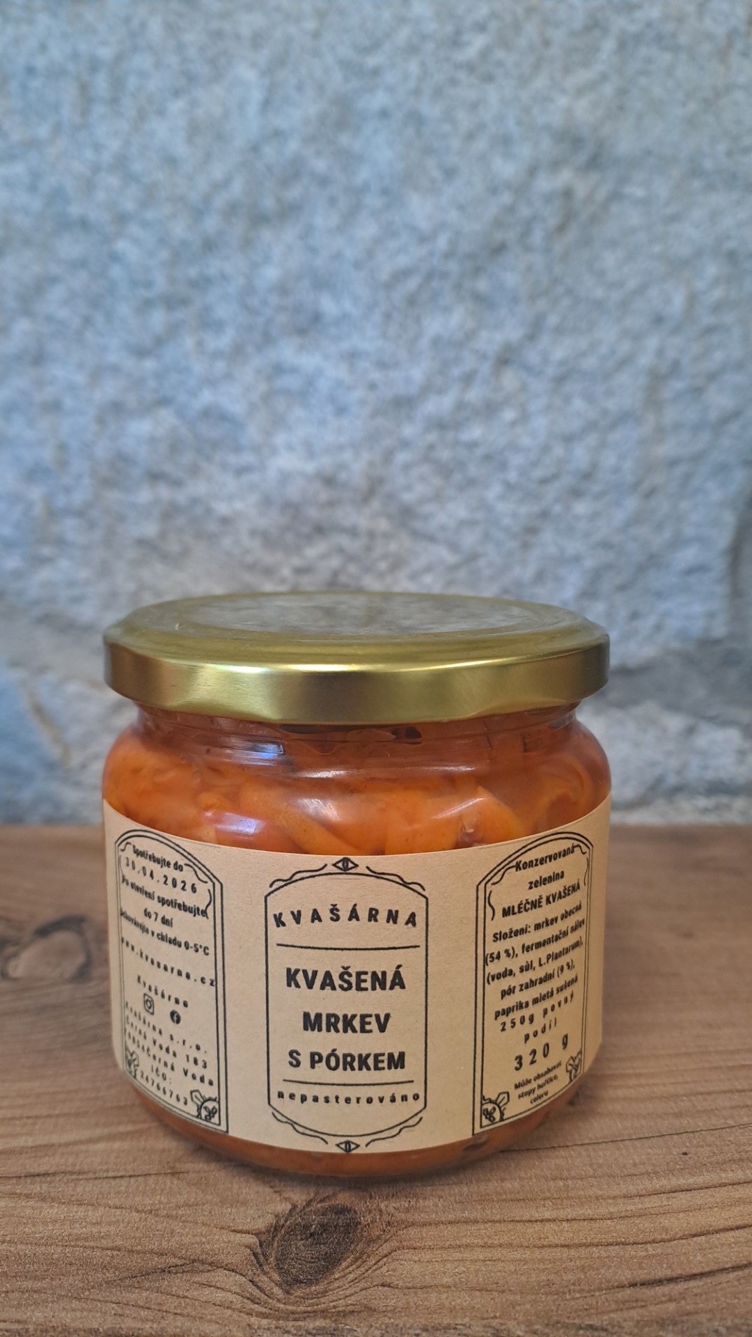 Složení: mrkev obecná (54 %), fermentační nálev (voda, sůl, L.Plantarum), pórek zahradní (9 %), paprika mletá sušená.