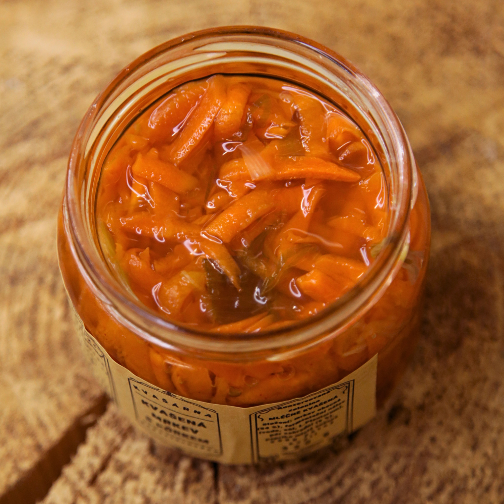 ✺ Jen tak ze sklenice ● Když máte chuť na něco jednoduchého a dobréhoSložení: mrkev obecná (54 %), fermentační nálev (voda, sůl, L.Plantarum), pórek zahradní (9 %), paprika mletá sušená.