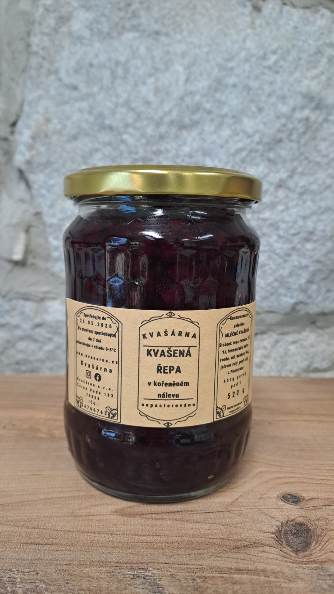 Složení: Řepa červená (57 %), fermentační nálev (voda, sůl, bobkový list, jalovec celý, pepř celý, L.Plantarum).