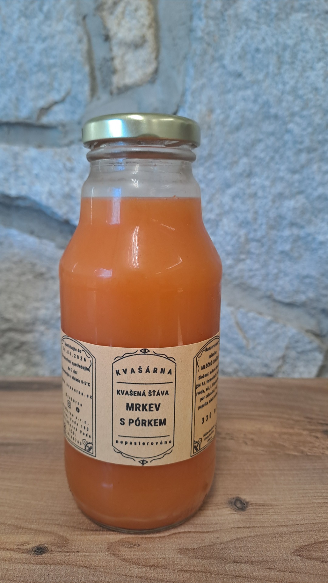 Složení: Kvašený nálev z: mrkev obecná (52 %), fermentační nálev (voda, sůl, L.Plantarum), česnek kuchyňský (4 %).