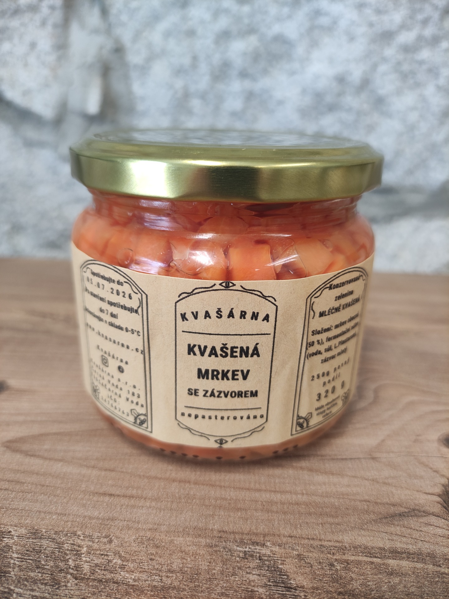 Složení: mrkev obecná (54%), fermentační nálev (voda, sůl. L. Plantarum), pór zahradní (9%), paprika mletá sušená