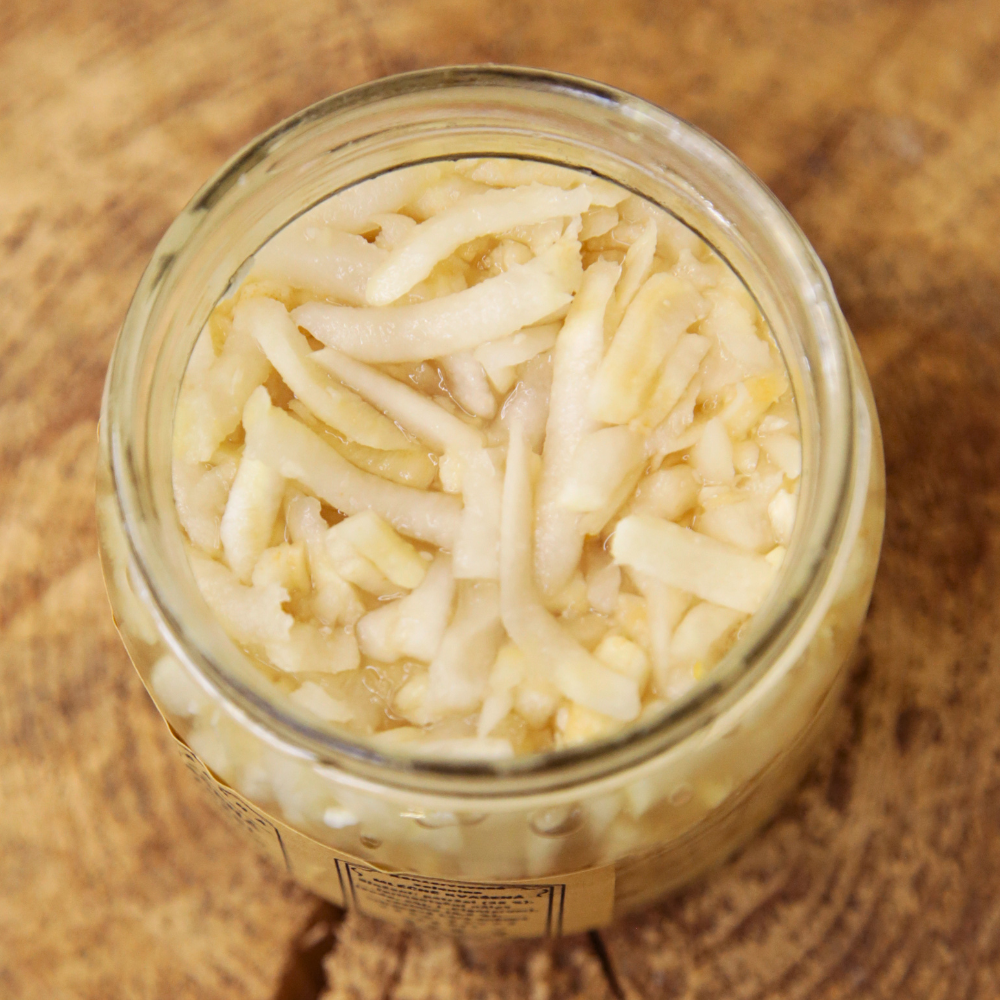 Petržel s rozinkami. Naše mléčně kvašená kořenová petržel je křupavá, jemně palčivá a sladká zároveň. Každé sousto vás překvapí kontrastem chutí a promění běžný talíř ve hru textur a aroma.